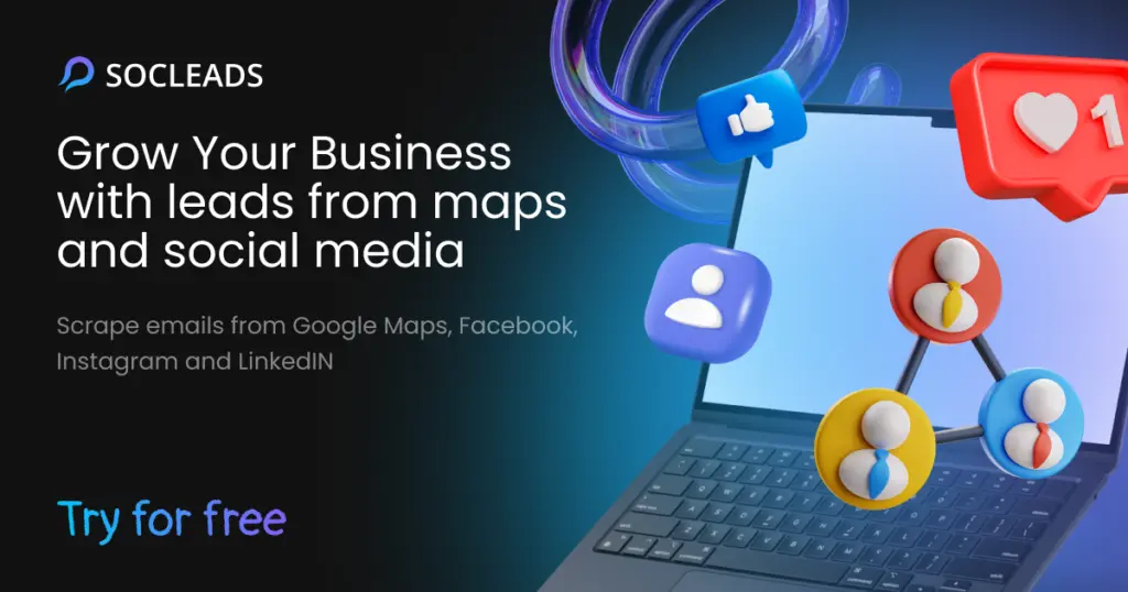• SocLeads – SocLeads is software that scrapes unlimited emails from Instagram, Google Maps, Facebook, Twitter, Youtube and Linkedin by keywords, followers and hashtags