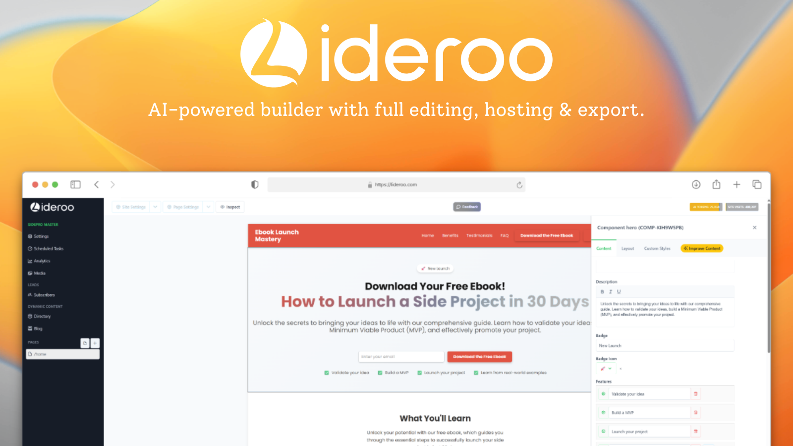 Elevator Pitch: Lideroo is an innovative AI-driven website builder that allows users to create blogs, directories, personal pages, and landing pages in just minutes.