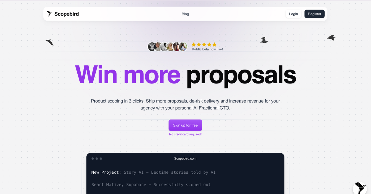 Elevator Pitch: Scopebird is an AI-powered product scoping tool that accelerates planning by creating accurate estimations, defining scope, and identifying revenue opportunities. It helps close more sales, retain clients, and prevent burnout among team members.