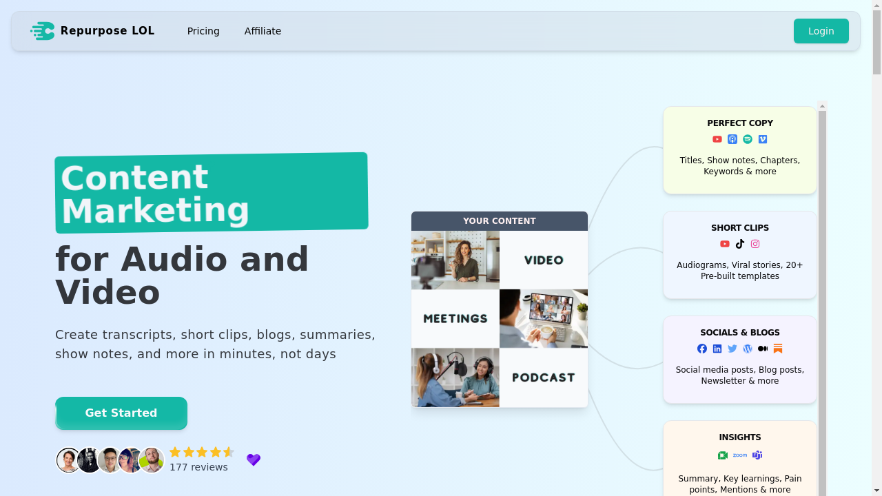Elevator Pitch: Turn your audio or video content into transcript, copy and viral clips in minutes. One stop shop for all content repurposing! Generate text copies such as blogposts, newsletters, titles, show notes, keywords, etc to improve SEO for your content. Get viral clips and stories for Instagram, TikTok, and X to reach new audience.