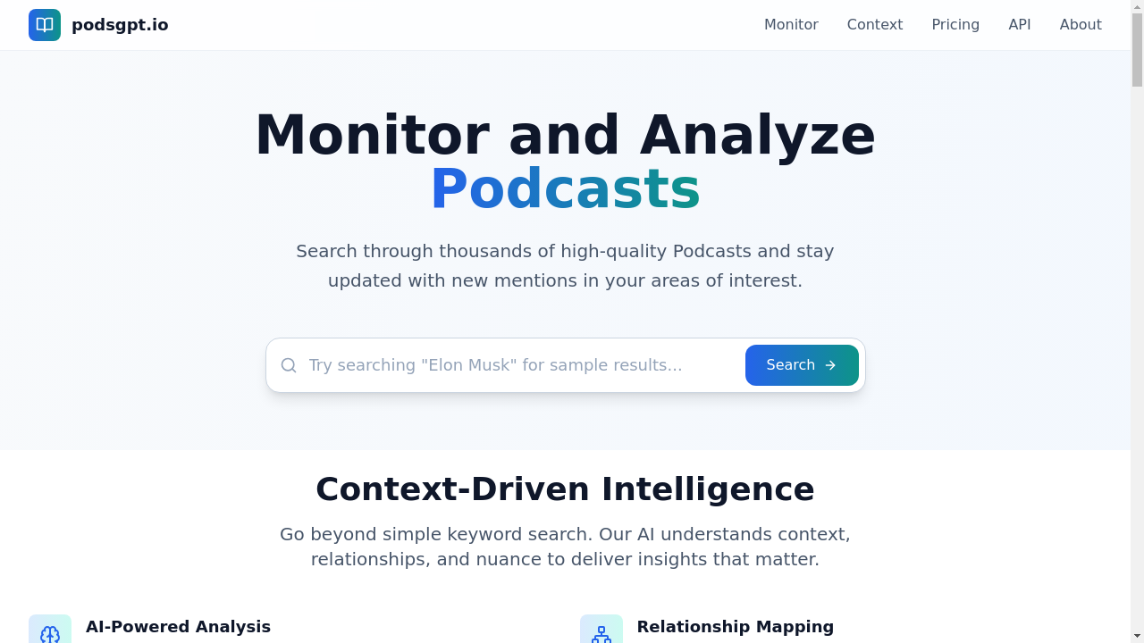 Podsgpt.io is an AI-driven platform designed to enhance podcast discovery and monitoring for users seeking efficient access to audio content.