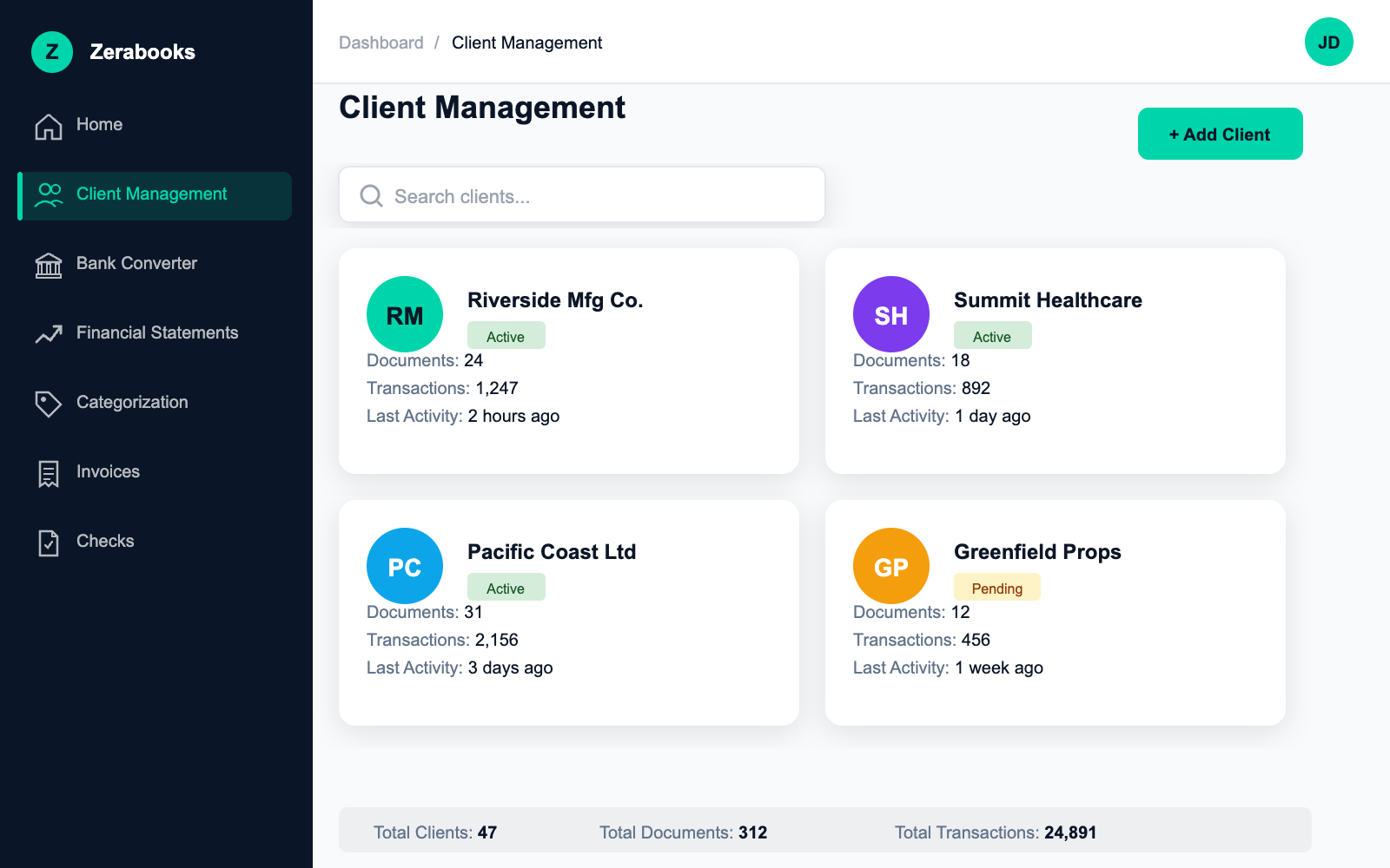 Our platform handles multi-account detection, duplicate prevention, batch processing of 50+ statements, and includes a client dashboard for complete workflow management. At just 79 dollars per month unlimited, ZeraBooks enables bookkeepers to eliminate manual data entry and focus on high-value client relationships.