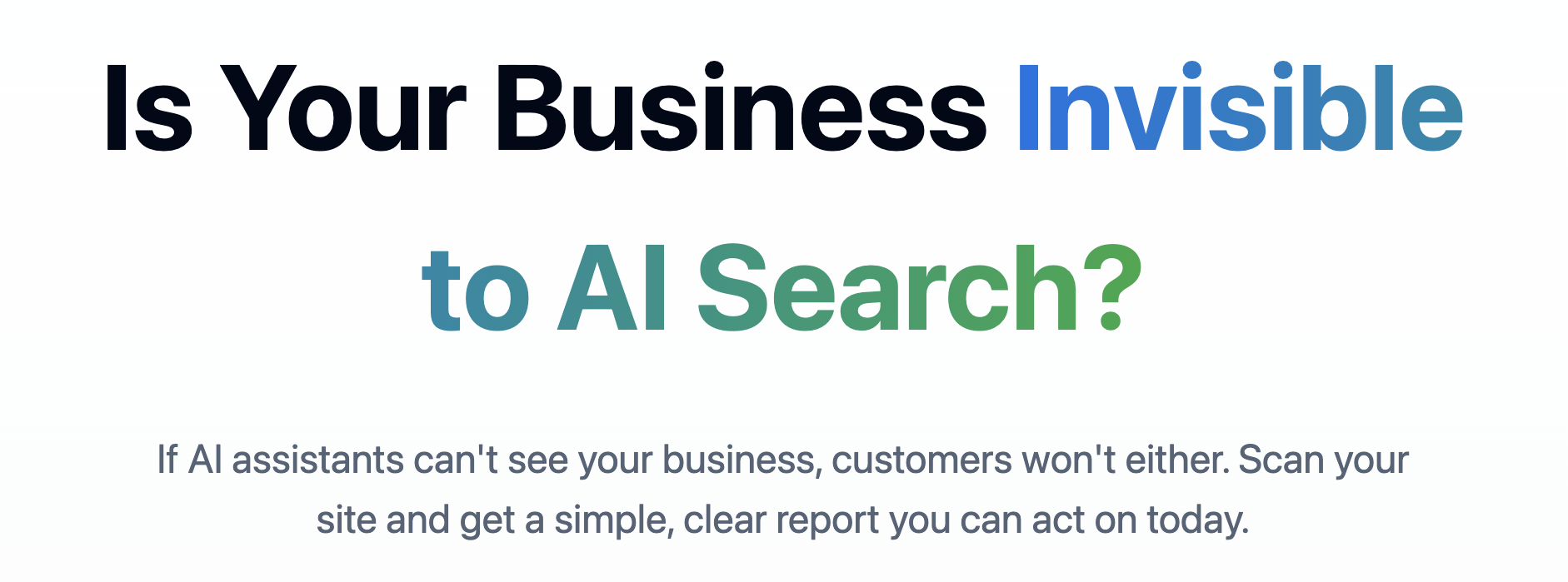 Elevator Pitch: If AI assistants can’t see your business, customers won’t either. Scan your site and get a simple, clear report you can act on today. We’re dedicated to helping businesses improve their visibility and relevance in the rapidly evolving artificial intelligence (AI) landscape.