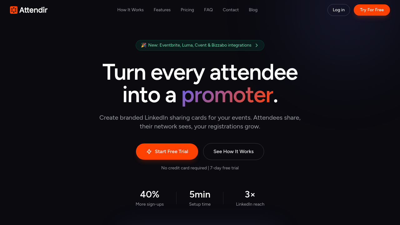 Elevator Pitch: Attendir is a self-serve event marketing platform that turns attendees into promoters. Organizers send a link to their attendees, who connect via LinkedIn OAuth and share a branded card promoting the event to their professional network with one click. Each share creates a tracked landing page with event details and a registration link, giving organizers full attribution on who drives signups.