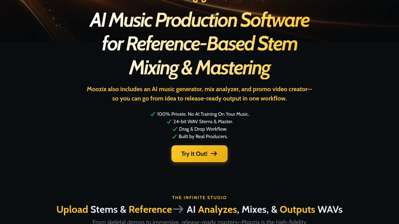 Tagline: Moozix is a web-based AI music production suite that combines prompt-to-song generation, AI stem mixing & mastering (including custom reference matching), mix analysis + chat feedback, and promo video creation.