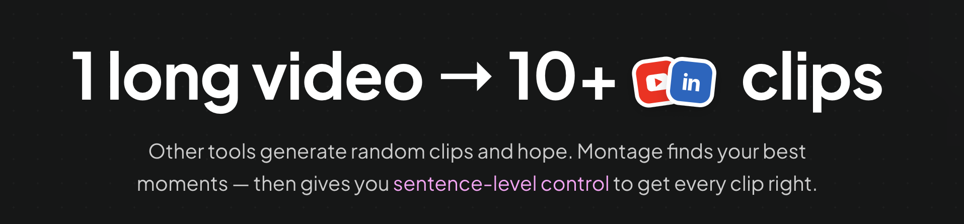Elevator Pitch: Montage turns long-form videos into social-ready clips using AI that understands your content goals. Upload your webinar or podcast, review scored suggestions (not random clips), refine by editing text — no timeline scrubbing. Scene-level AI ensures natural boundaries and complete thoughts. Export to LinkedIn, YouTube Shorts, Instagram. Built for B2B marketers who need speed and editorial control without video editing expertise.